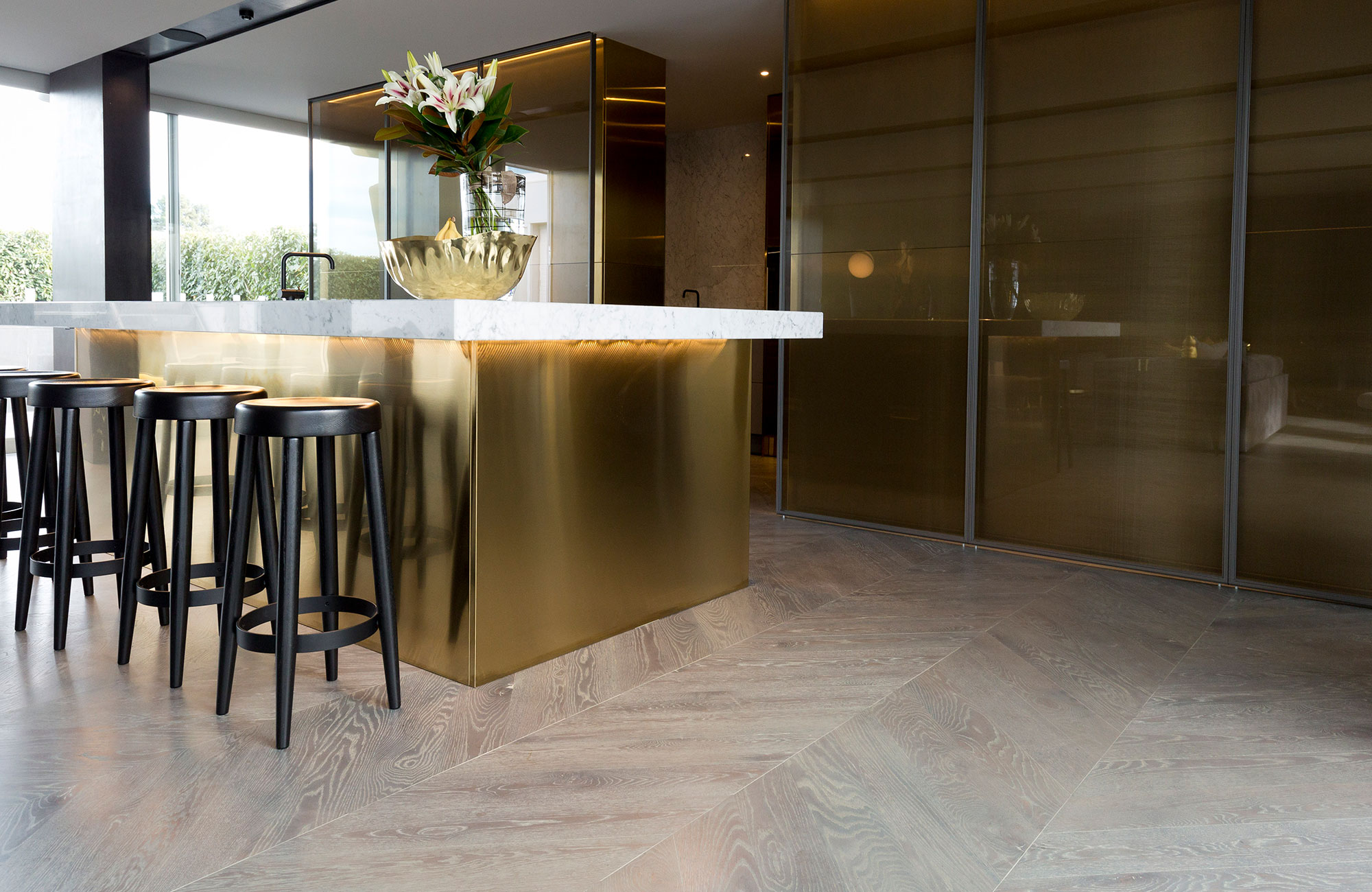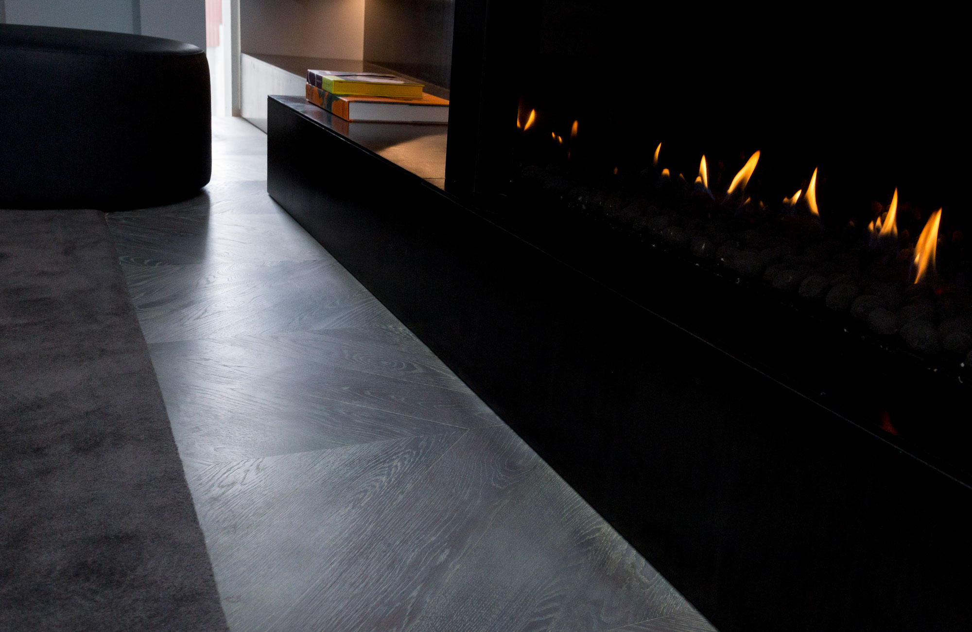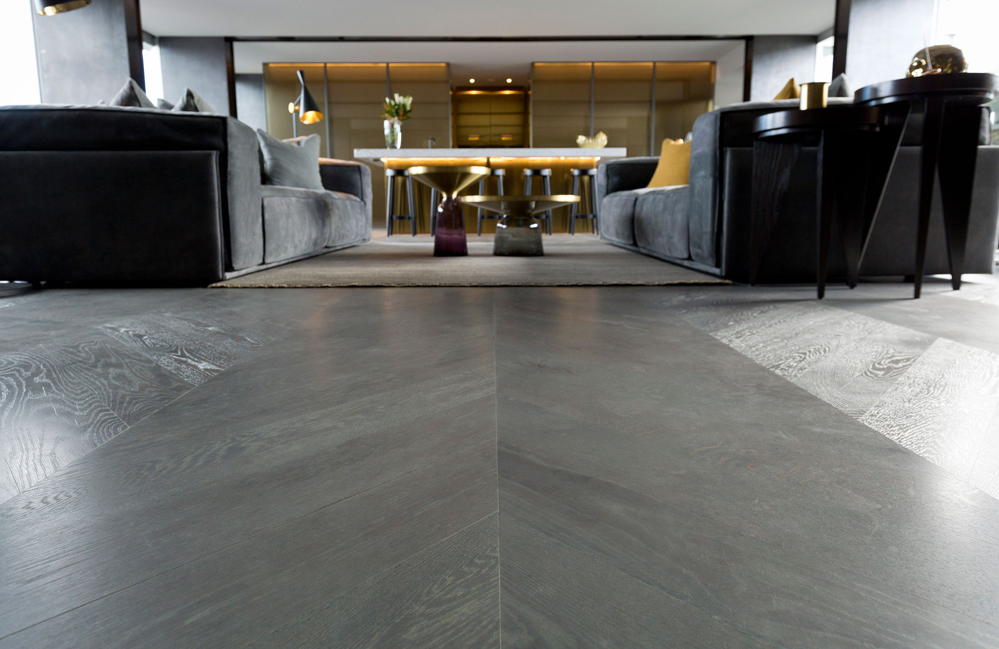 American Oak Feature Grade 135 x 18mm block flooring, installed in a Chevron pattern with a grey stain and coated in hardwax oil.