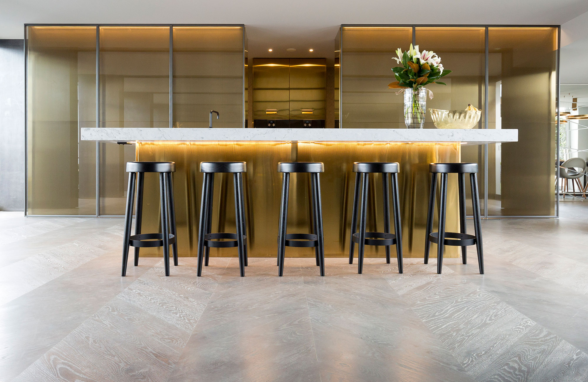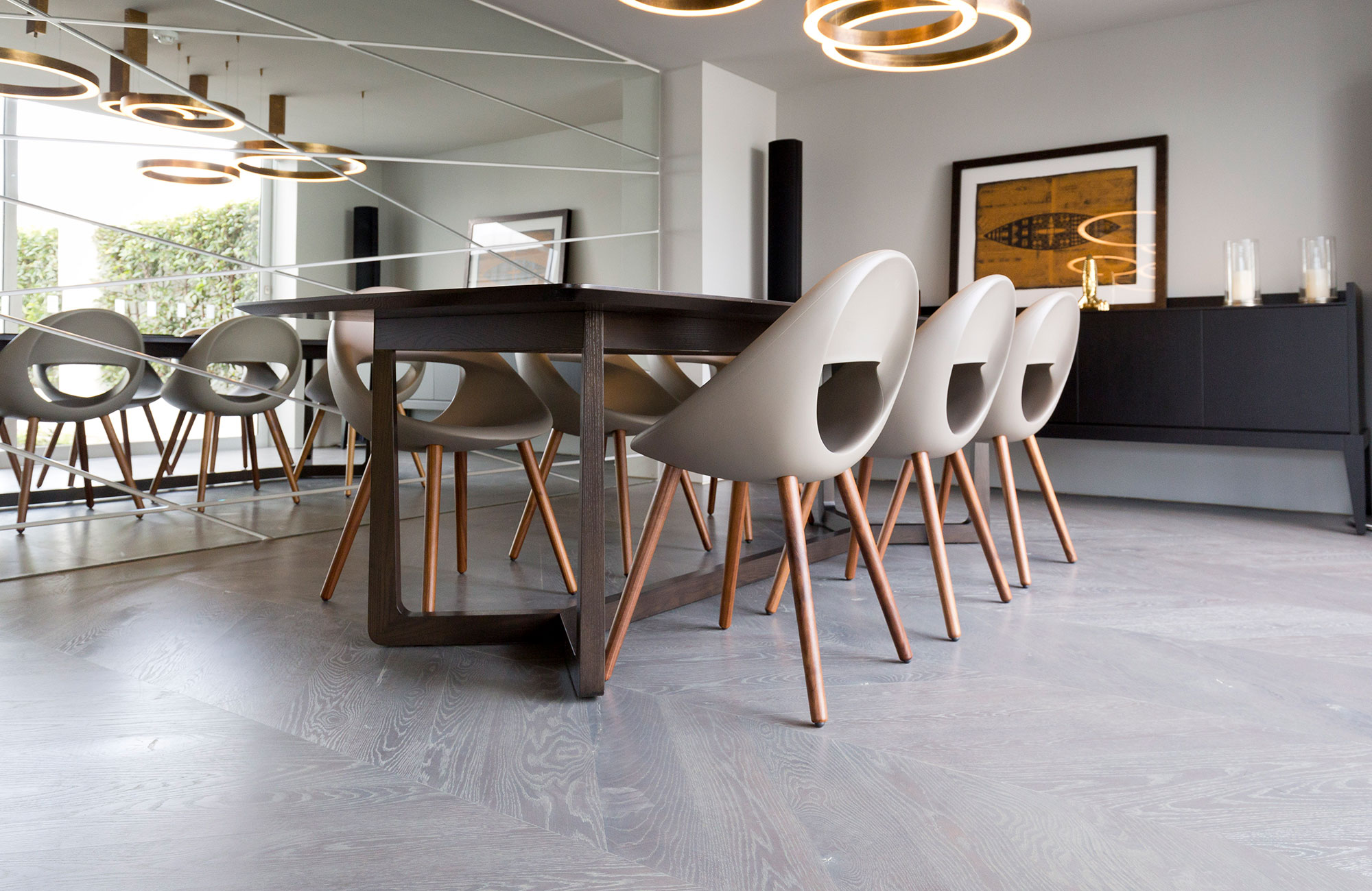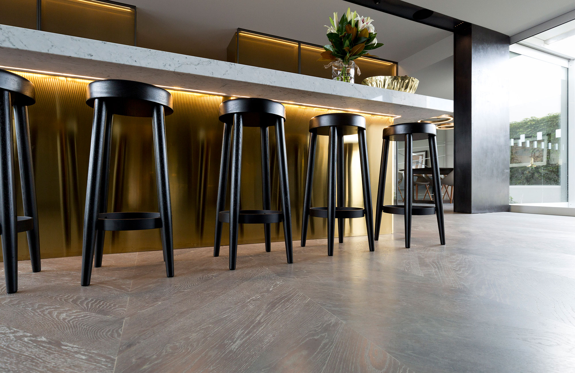 American Oak Feature Grade 135 x 18mm block flooring, installed in a Chevron pattern with a grey stain and coated in hardwax oil.